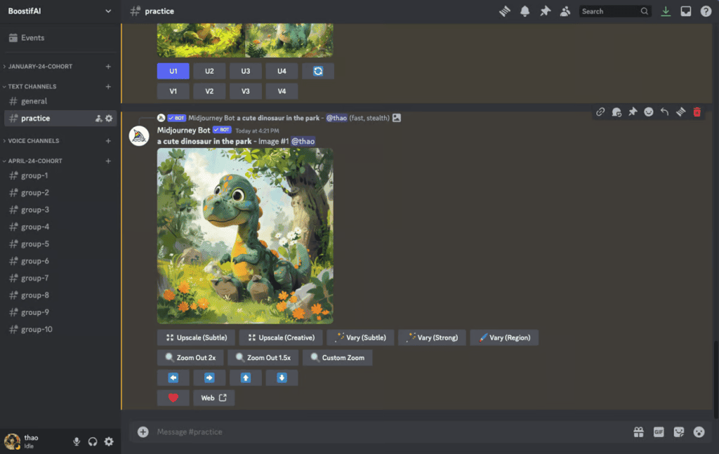 - Click on the “U” button and Midjourney will start the job to process the generation of the upscaled image